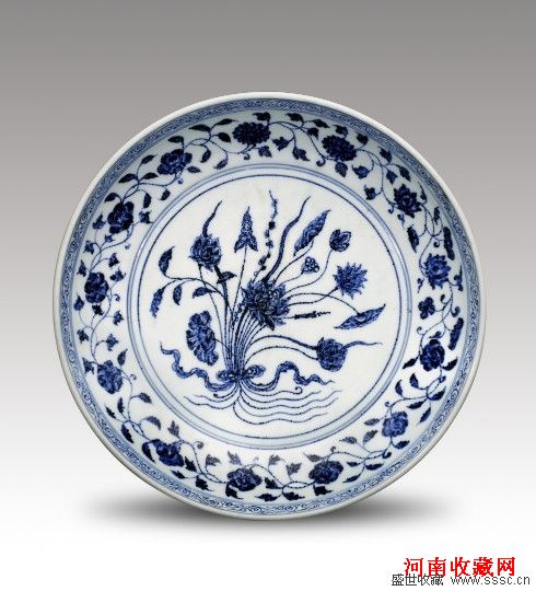 该盘直径35cm,撇口,弧形壁,浅圈足,胎壁厚薄适中,造型端庄大气。胎骨坚致细腻,足部刮釉处有少许火石红痕迹,器底砂底无釉,微泛少许火石红,抚摸时有如糯米粉状,釉质肥腴,釉色白中闪青。盘心绘莲花、莲蓬、茨菰、浮萍等水生植物,以缎带束在一起,故有“一把莲”之称。内外壁分别饰缠枝四季花卉纹,莲花、菊花、牡丹以及石榴花;内、外口沿分别绘一周卷草纹,外壁接足饰回纹一圈。构图疏朗有致,画意古朴典雅。青花发色浓艳,凝重浑融。青料之聚集处成铁褐色,凝重处呈黑色结晶斑,深入胎骨,抚之有凹凸不平之感。在釉面映衬下,产生一种梦幻般的锡光效果。极具永乐御瓷之典型特征,实为同类作品中的上乘之作。