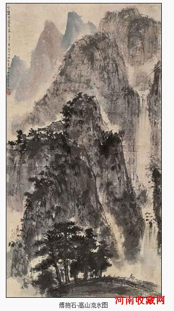 傅抱石1961年作《高山流水图》以425.5万高价成交。此幅作品画面上部,大笔挥写山体,削壁飞流,简而放,挺而苍,使笔重而迅,如刀劈斧凿,似风雨骤至。在视觉上给人以巨大的冲击和震撼。山石用如椽巨笔散锋横扫,墨色酣畅。飞瀑则纯以留白而出,突出画面明与暗,粗放与精谨的反差。唐朝大诗人李白的诗句“飞流直下三千尺,疑是银河落九天”从画面上得到最佳的佐证和最好的诠释。山脚居士,抚琴观瀑,寥寥数笔,神态已足。画中人物虽只占很小画幅,但神态高古,衣服纹饰柔韧而飘逸,最终高价成交。