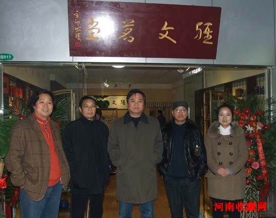 开业当天,郑州市文联主席钟海涛(中)、书画家陈濂波(左一)、书法家李明恒(左二)、画家吕宝林(右二)前来祝贺并与“雅文茗堂”堂主史雅文合影