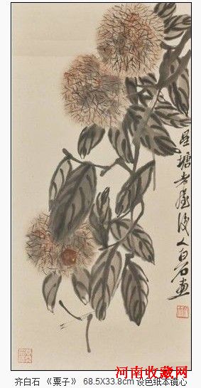 白石老人乐于描绘日常生活中简单质朴却美好寓意的事物。栗与“利”谐音,有“大吉大利”、“利市”的吉祥寓意。又栗子与 “立子” 谐音,是求子的吉祥物,迎合了广大民众趋利求吉的心理,雅俗共赏。画面折枝构图,栗叶是用软毫蘸淡墨写出,叶脉和枝干以浓墨勾勒。栗子外表则用硬毫露锋快速点画而出,再用藤黄加赭石晕染局部,表现出毛茸茸的质感,笔法放逸,层次丰富。画面左下角题款“星塘老屋后人白石画”。