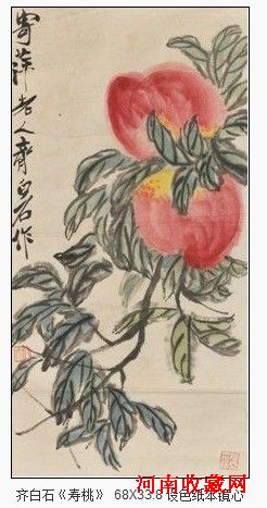 此幅《寿桃》以没骨大写意绘制,以明丽的洋红描绘硕大的桃实,局部以柠檬黄渲染,用色单纯醒目,造型厚重结实。再以花青写叶,通过颜色的深浅表现出阴阳向背关系,并以浓墨勾勒叶脉。画面采用对角线构图,枝叶、果实疏密相间、错落有致,表现出旺盛的生命力,画风简括大气。寿桃是白石老人晚年经常描绘的题材之一,寄予了美好的愿望,象征多寿多福,世人常以桃祝寿。画幅左侧有作者款识“寄萍老人齐白石作”。