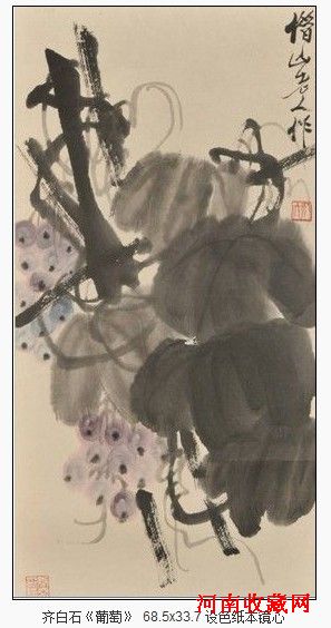 白石老人常画葡萄,此幅《葡萄》以篆书笔法画藤条枝干,画中藤条或刚韧廷直,或蟠曲环绕,形乱而理顺,线条劲健有力。叶片用软笔湿墨写出,墨色淋漓变幻,通过浓淡的变化表现出丰富的层次;没骨法点出的葡萄隐现在藤条、墨叶之间,晶莹剔透,犹如一串串紫色的明珠,呈现出旺盛的生机,也营造了画面明朗乐观的基调。葡萄籽多,因而寓意“多子多福”。画面右上角题款“借山老人作”。