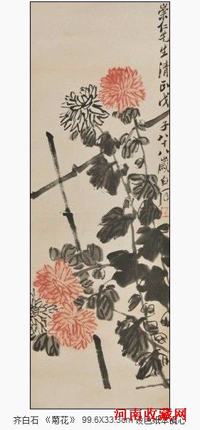齐白石(1863—1957),原名纯芝,后名璜,字渭清,又字兰亭,号濒生,别号白石山人、寄园、寄萍、寄萍堂主人、老萍、萍翁、寄幻仙奴、阿芝、木居士、三百石印富翁、杏子坞老民,借山翁、星塘老屋后人、湘上老农等,湖南省湘潭县杏子坞星斗塘人。曾任北京国立艺专教授。建国后任中央美术学院名誉教授、北京画院名誉院长、中国美术家协会主席等职。1953年被授予“中国人民艺术家”的称号。世界和平理事会授予其1955年度国际和平奖金。白石老人将文人传统与民间传统,文人修养与农民气质自然而然的结合了起来,创造出雅俗共赏的绘画作品。他的花鸟画在师法徐渭、八大山人、石涛的基础上,又吸收赵之谦、吴昌硕、陈师曾等人的长处,为中国传统的大写意花鸟画注入了蓬勃生机,自创“红花墨叶”一派,风格单纯平直、鲜活有趣,充满明朗乐观的基调。