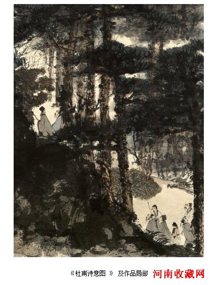 抱石先生有句名言:“大胆落笔,细心收拾。”这是他长期艺术实践的总结,他的成熟期的作品大都按照这样的程序完成,所以我们在欣赏他的作品时,除了体会它的大气磅礡的大气势、大气象之外,还要仔细品味它的细部收拾的微妙,如泉口的处理、云烟的的烘染,尤其是点景人物的安排,真是恰到好处,更移不得。 斯图下端,山坡树林间,作高士七、小童一。分两组,前行者二:一策杖回首,一仰面似有所思。后随者六人,或举目远望,或回顾来程,或相视低语,或冥思索句……其中谁是工部?或为后随第二人,白衣策杖低语者;或为最后之白衣袖手觅句者。六十年代抱石先生作过数幅杜甫像,当可用以比较。 图中人物,皆用洒脱的细线疾写而出,神采奕奕,错落有致,与前后景致浑然一体。顾恺之的古韵,石涛的逸兴,傅抱石的激情,融合在一起,难分难解。