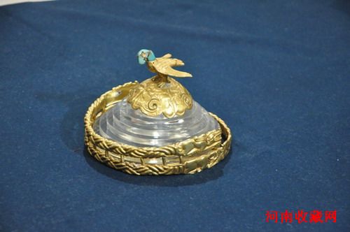 鹰顶金冠饰是这批遗物中最有代表性的艺术珍品。冠带直径16.8厘米,鹰高6.7厘米,重1211.7克。冠顶傲立的雄鹰采用圆雕的手法塑动物造型,以夸张的手法突出钩状的鹰喙,表现其凶猛。其余的动物纹都为浮雕图案,比例夸张,刻画细腻,虎张口露齿,羊巨角盘卷,马低首伏卧,整个冠饰展示了雄鹰俯瞰狼羊咬斗的搏斗场面。这套金冠饰是迄今所发现的唯一“胡冠”。自战国赵武灵王效胡服骑射以后,胡冠传入中原,将冠上的雄鹰改为鹃尾,即赤雉长尾。这种冠饰应是匈奴王或酋长的冠饰。