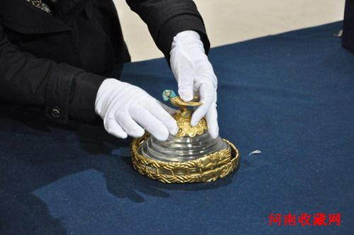 在展厅里,工作人员小心翼翼地从箱中取出匈奴“王冠”(左图)。经过两千年的地下埋藏,“王冠”仅存鹰形金冠顶和金冠带两部分。记者近距离观察,金冠顶呈半球体,上浮雕四只狼和四只盘角羊组成的咬斗图案,冠顶立一展翅雄鹰,居高俯视。金冠带由黄金铸成,冠带前部有上下两条,中间及其末端之间有卯榫插合连接,两端有卯榫与冠带前部相连接,组成圆形。冠带左右两边靠近人耳部分,每条的两端分别有卧虎、盘角羊和卧马的浮雕图案。