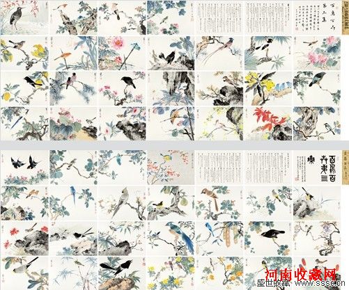此番付拍的《百鸟百卉册》正是江寒汀独步画坛的不二秘诀之作,也是他传世最为精彩的作品。《百鸟百卉册》凡四大册,规制一致,每册二十八开,其中二十五开各绘花鸟一种,花或含苞、或竞发、或笑人、或解语、或羞怯、或明妍,各各曲尽其貌;鸟则或呼朋、或引伴、或迎风、或栉雨、或修喙、或理羽,在在栩栩如生。展册观之,仿佛置身百花丛里、百鸟林中,令人目不暇接、流连忘返。
