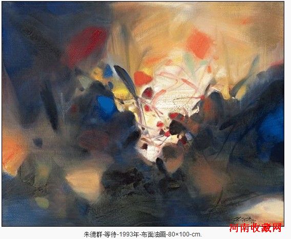 朱德群在1990年代的创作已经达到了圆熟无碍、行止自如的境界,每一幅作品都以抽象手法呈现出特有的深邃诗意,1993年他创作的《等待》尤属其中佳作。画面浓稠的暗调与中心位置高明度的色块,似乎形成了光与暗的交锋,灵动富于节律的笔触与跳跃鲜明的色块,构成了充满张力的色彩场,是东方哲学中阴阳两个基本元素生生不息、相辅相成的具体呈现。