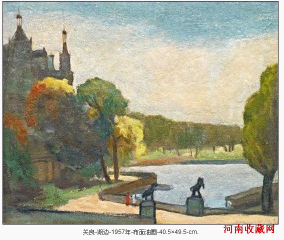 《湖边》是关良1957年访问德国期间的创作,被收录于多本关良画集,其中包括1982年四川人民出版社出版的画家第一本油画专辑《关良画册》,该画册仅收入五十幅画家各个时期的代表作品,《湖边》是其中的佼佼者。