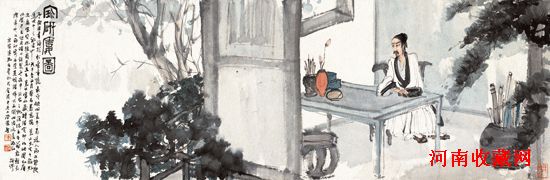 题跋:宝研楼图。予向治画论,于《松壶画忆》最所倾心,盖平易近人而又能抉透此中之秘者也。戊子春正月,蔡君慕慈携莱公先生手翰见示,属写宝砚楼图卷。且云:莱公富收藏、精鉴赏,即如此图已有心畬、午昌、越园诸公巨制。予敬申欣然之忱,惟珠玉其前,敢轻易涉笔也?久雨初霁,为营是帧。惜烽火正炽,心绪过差,尚乞指谬。新喻傅抱石并记于金陵中央大学讲舍。