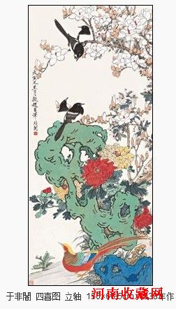 《四喜图》绘于1938年,是于非闇拟北宋画家赵昌笔意,实出己貌的工笔花鸟精品。画面布局丰富而严谨,色彩明丽典雅,描绘春日的园林一隅:玲珑剔透的太湖石边,牡丹灼灼盛放,花白胜雪的玉兰、海棠随风摇曳,一只七彩锦鸡昂首翘尾伫立,四只喜鹊,两两相依,顾盼生姿,为昂然的春景平添无限生机。画家将喜鹊、牡丹、海棠、锦鸡、太湖石共呈一堂,代表玉堂富贵、添喜长寿,寓意吉祥美好。