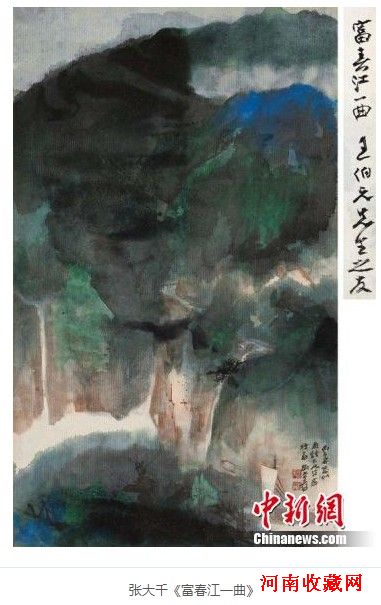 《富春江一曲》为大千1966年所作,此时的大千侨居巴西,大胆出新,泼彩技法已臻成熟,此幅氤氲满纸,而大千于一片混沌中,巧心经营,布置流泉飞瀑,白帆行江,一下增加了画面的生意。此幅上款人王孟钟先生为银行家,曾任中南银行天津分行总经理。此幅由其后人委托上拍,来源可靠。