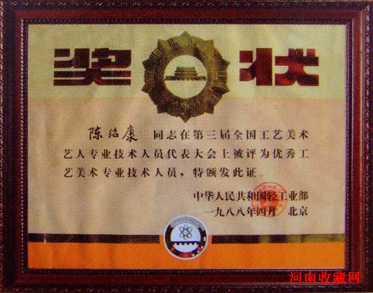 陈绍康,云南省红河州建水县临安镇碗窑村人,现年74岁,出生于制陶世家。建水美术陶厂原技术副厂长。能书会画,精于雕刻设计,谙熟一整套建水制陶工艺流程,先后两次获国家轻工部“百花奖”、“优秀创作二等奖”。1979-1991年三次分别受到邓小平、江泽民、李*等党和国家领导人接见,95年被联合国教科文组织和中国民间艺术协会授予“民间工艺美术家称号。”