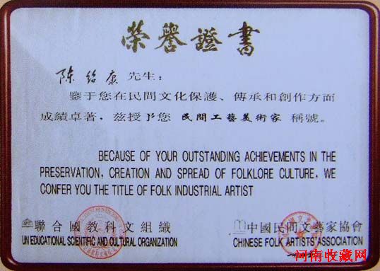 名称:精品方壶(陈绍康亲笔写收藏证书)