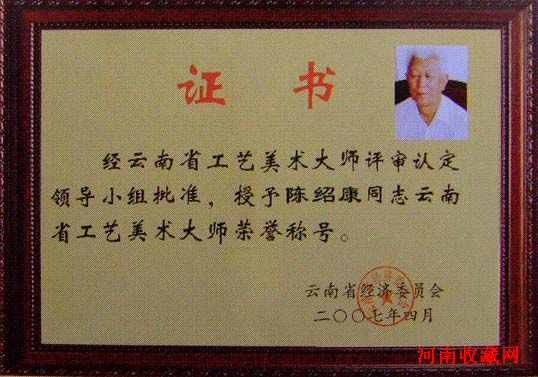 在2009年10月15日举办的云南省工艺美术第三届“工美杯”精品评选中,年过七旬的陈绍康大师与儿子陈俊共同创作的建水紫陶作品《残贴彩填小口梅瓶》被评委一致打了高分,一举夺得了金奖。业内专家认为,其新法彩泥刻填工艺为建水紫陶的创新发展树起了一个新的里程碑。 陈绍康:1939年生,当代紫陶名师,云南省工艺美术大师,建水紫陶唯一的国家级非物质文化遗产传承人。其13岁随父亲学习制陶,在50余载的从业实践中,不仅谙熟建水紫陶的整个工艺制作流程,而且精于雕刻,能书会画,其紫陶工艺品以其新奇古美的艺术造型和功力深厚的书画装饰独具一格,深受业内人士的赞誉和收藏家青睐,曾分别于1997年、1988年、1991年三次赴京受到党和国家领导人接见。1995年被联合国教科文组织和中国民间文艺家协会授予“民间工艺师美术师”荣誉称号。并多次在国内各种评比中获得大奖,多件作品被国家珍宝馆收藏,为建水紫陶的继承和创新做出了不可磨灭的贡献。如今,尽管陈大师已年逾古稀,满头银丝,但他仍然壮心不已,积极探索,时刻都在思考建水紫陶的传承与发展问题。