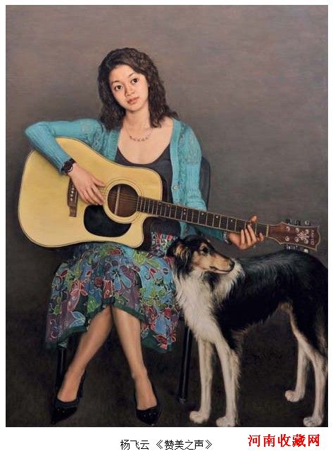 杨飞云的《昙花》、《窗边少女》、《赞美之声》三件作品在创作年代上跨度自90年代初至2006年,表现题材及手法亦时间阶段性显著,可清晰的展现出杨飞云油画发展的脉络。《昙花》创作于1991年,《昙花》作为此时期的一幅室内模特写生,画家精心考究每个画面细节,却不拘泥于其中,昏黄的光线下女模特健康、匀称的身体和左侧的绿色植物互相呼应,似乎都在蕴藏力量,等待昙花一现的奇迹。整个画面呈现出充实和动人的大气,也可看出画家一直以来朴素的艺术追求。《窗边少女》创作于1995 年,与《昙花》相比,画家更注重探讨人物内心世界的传达,技法上进一步融合中西,人物造型更加古典。《赞美之声》创作于2006年,相比90年代的画作,艺术技法臻成熟。画中女子身着蓝衣花裙,怀抱吉他,沉浸在悠长的歌声之中,姿态安详,表情含蓄。无论是人物还是画中小狗,画家都细致刻画毫不放松,饱满而生动,端庄朴素的画风中流露出画家对于生活和艺术的礼赞。