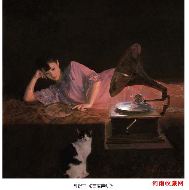 陈衍宁一直以纯熟的技法和坚实的造型能力为其突出特点。《西窗声动》描绘了一侧卧女子凝神静听音乐的动人场景。此画采用平稳的横向构图,在大面积的深棕色背景中将光线集中在画面中心位置并投射开来,女子的温婉古典、灵动于安静被刻画得淋漓尽致,前景的老留声机和花猫打破横向构图,为画面增添层次和节奏美感。《今夕是何年》是他的代表性作品之一。作品中迷人的轮廓线和结构美,使人为之叫绝。画面中心两位古典仕女一前一后站立,手持三盏红灯笼,小三角构图使得画面稳定感突出。他对色彩运用极为灵活,色彩效果丰富,色调和谐,画面境界的创造极为优雅。