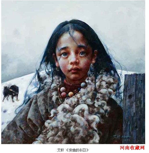艾轩的最大特点是借景抒怀,他画西藏高原的景色和孤独的人物,主要是为了抒发自己内心世界的感情。因此,他的作品与其说是西藏风情画,毋宁说是他内心的独白。在每一幅幅画中,都有艾轩的影子。沉默无语和静静思考,无名的孤独感渗透在画中人物和整个画面气氛之中。独自一人在望无际的草地、雪野、荒原,她们生活在与大自然融为一体的世界里。此次上拍艾轩的《安曲的冬日》和《歌声飘散》,便是其典型风格的再现。