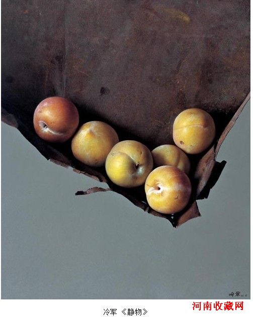 冷军的作品以其独到的构思结合非凡的艺术技巧令当今中国画坛瞩目,其作品的最大特点就是极端写实。此幅《静物》描绘了陈旧的铁皮箱一角凑集的水果景物。画家逼近每个细节,水果的水灵新鲜、甚至表面淡淡的白霜都刻画的淋漓尽致,精致入微。画家没有放过陈旧粗糙、布满锈迹的铁皮,孜孜不倦的呈现每个细节,更是衬托出了水果的晶莹与剔透,并充分展示出画家写实的功力。画面构图十分简洁,以简化原则突出表现事物的存在,充满感染力。冷军以水果为题材的作品十分稀少,此件质量在仅有的几件同题材作品中又为上层,实属难得。