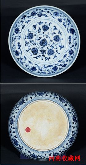明代瓷器上之植物纹饰,花朵及叶片大多呈现自然而对称的排列方式:一种为自然呈现,讲究形似,如此盘内沿所绘;另一种则以意创造,略重神似,叶片卷曲而繁复,装饰性稍强,如盘心所绘。后者亦可见于明初佛像,以莲花作为纯洁的象征。相同纹饰之例,伊朗阿德比尔圣庙旧藏中有两件,录于John Alexander Pope著《Chinese Porcelains fromthe Ardebil Shrine》,华盛顿,1956年,编29.118-19,图版36(右下);Basmadjieff藏品中另有一件,于此件成对,售于伦敦苏富比(微博)1972年3月14日,编号129;Scheinman收藏中亦有一例,曾展于《Born of Earth and Fire》,巴尔的摩艺术博物馆,巴尔的摩,1992年,编号203。有一相同纹饰宣德款作例,藏于伦敦维多利亚与艾伯特博物馆,载于Harry Garner爵士,《Oriental Blue and White》,伦敦,1954年,图版16。