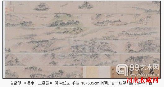 自文氏自跋可知,此《吴中十二山水卷》当是文徵明宦中有桑梓之游,归京师后情不能已,故以细笔勾勒、平淡叙事,一一刻画其心目中最能代表吴中、最能纾解乡愁的山水景致,用以自珍、自娱、自解——其10×635cm的形制本意即在此,这也是文徵明传世作品中惟一之作;卷上阳山、虎丘、支硎、天平、天池、灵岩、横山、治平、虎山桥、玄墓、垚峰、洞庭十二景互为穿插、掩映,娓娓而出,各各跃然纸上。这些胜处,本来即是文徵明远赴京都之前饱游饫看惯了的,故此刻虽远在千里之外,亦能一一刻画逼肖,尤见文氏功力。