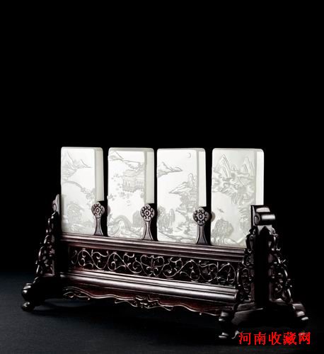 此套插牌由四块和田玉牌组成,玉质细腻,色度白润。作者以深浅浮雕技法雕琢“西湖四景”,将西湖春夏秋冬四季美景以苏堤春晓、曲院风荷、双峰插云、断桥残雪来表示,尺山寸水之间尽显西湖迤逦风光,充满人文情趣。
