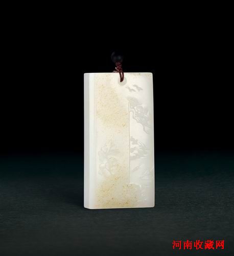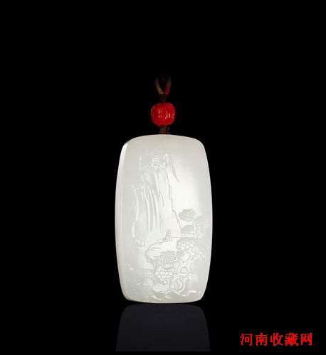 作品为新疆和田籽料,洁白细润,牌型规整厚实。题材选用《庐山观景》,牌面作远山近水,小桥松树,二老一坐一立与瀑布前观景,神态生动传神、主题鲜明、构图饱满,雕工精细而简约;背饰松树及诗文,字体飘洒有序,典雅精美,可谓当代玉雕作品牌子中的精品之作。