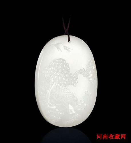 此牌为椭圆形,玉质细腻白润,局部留皮色。以高浮雕技法雕琢“江中论道图”,但见清风徐来,水波不兴,两老者坐于一叶扁舟之上,泛游论道于江中。而鳞次栉比的亭台楼阁、郁郁葱葱的参天大树、弯若彩虹的拱桥以及远处渐隐渐现的群山,则一起构成了这幅清和朗润的“江中论道”山水画。