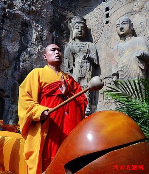 上午9时许,在位于龙门石窟的奉先寺佛乐声声,通道两侧分别悬挂着巨型“福”字。释印乐及高僧们身着黄色僧袍,齐聚在卢舍那大佛前。这里是“万人祈福大法会”的主会场,而一河之隔的龙门石窟东山礼佛台是分会场,中间是象征“鲤鱼跳龙门”的伊河。
