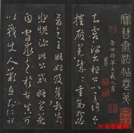 孔继涑为张照之东床,书得其法,收藏亦富,且精鉴别。张照书法早年学董其昌,并得其母舅王鸿绪的亲授。由此推知,张照很可能从王氏后人手中得到此帖,传至女婿孔继涑。孔氏将此宋拓宝晋斋法帖视同墨迹,一丝不苟地摹刻入玉虹鉴真帖中,可见宝晋斋法帖之稀见及孔氏对此帖之宝爱。此外,我们发现《宝》帖中有一枚“孔庆琛印”,虽不知其详,但说明此帖曾被孔氏后代保管,虽历经岁月磨砺,依然品相端好,古香怡人。