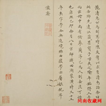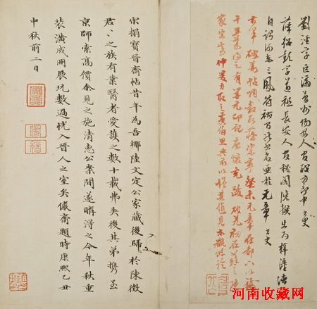 陈继儒身后数十年间,此帖由族人精心保管,后其弟携至京城,被时任副都御使的施维翰收之案头。康熙乙丑(1685)秋,陈继儒的华亭同乡王鸿绪见先达所藏墨宝,以重金购得,并重装成册。王鸿绪(1645-1723),初名度心,字季友,号俨斋,康熙十二年(1763)进士,官至工部尚书。曾入明史馆任《明史》总裁。精鉴赏,工书法,书学米芾、董其昌,具遒古秀润之趣,“奄有魏晋以来诸家之长”。因此,在得到这部《宝晋斋法帖》后,他展玩数过,沉湎其中,恍入晋人之室,十余年来,一直宝爱有加。康熙己卯(1699年),年过半百的王鸿绪忆及购帖往事,不禁又提笔作跋,对先贤珍藏墨迹在流传过程中的聚散有感于怀。之后,此帖被王氏子孙递藏,上有王鸿绪之孙王兴谟的藏印。