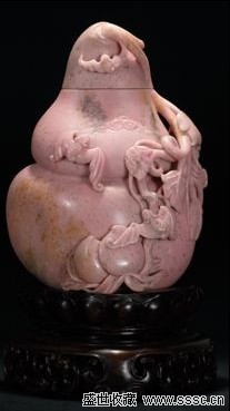 此件摆件取材和田紫罗兰玉中的上品,通体粉紫色,温润无暇,块度硕大,雕刻宝葫芦摆件,藤蔓盘绕,蝙蝠寿桃饰其上,工艺精湛,意趣盎然。