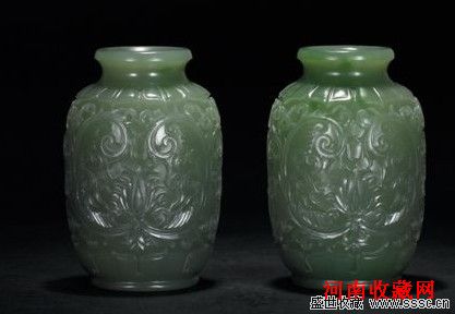此对痕都斯坦缠枝花灯笼瓶便是由7号坑出产的上等俄碧一级料精雕而成,材质莹润无暇,碧色鲜嫩欲滴,造型庄重圆润,极具几何对称和谐之美。其制作工艺采用水磨技术,通体玲珑,鬼斧神工,在装饰手法上采用浮雕、立雕、镂雕等复杂的组合工艺,表面处理采用剔地阳文的方法,形成凹凸的视觉反差,花纹装饰为缠枝花,更显示出亦谐亦庄的艺术性,极为精美绝伦。