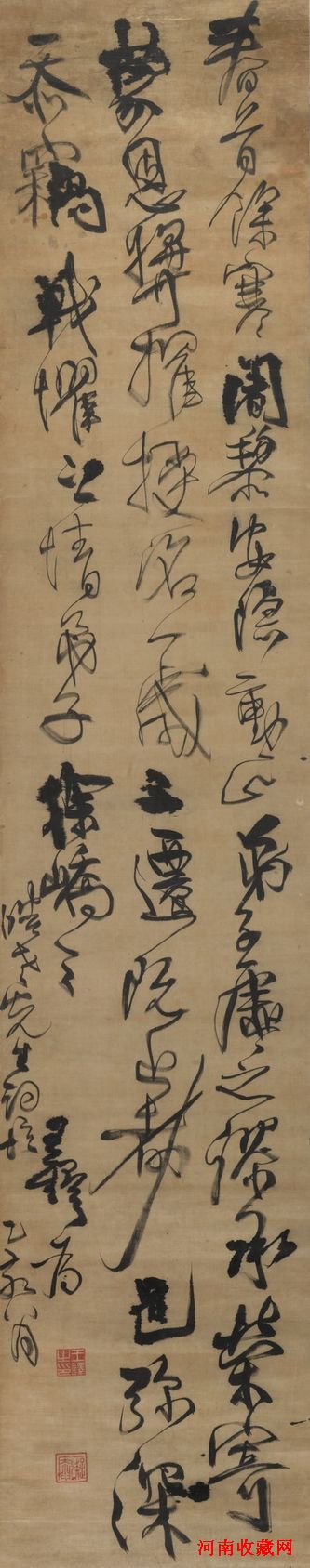《临徐嶠之帖》创作于王铎四十四岁,王觉斯时居北京,任隶属詹事府的左、右庶子。原帖是《淳化阁帖》第四,题为《唐洺州刺史徐嶠之书》。王铎所书条幅、中堂幅式作品中,凡自书诗皆用行书,凡草书,尤其是大草书皆“临”《淳化阁帖》。全书笔走龙蛇,一气呵成,字字珠矶,笔笔温润,深得逸少圣教遗韻,而又将匠心独运,使用“涨墨”使作品出现雄强粗犷的特性。狂笔缠绕的连绵与逸笔跳跃的节奏,纵横奇崛,节拍适宜,表现出憾人心魄的磅礴力量。《中国书法全集》评其“为同一时期王铎行书的典型作品”。