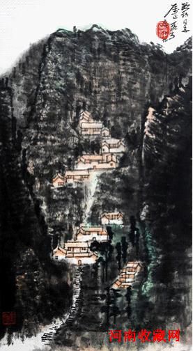 此幅《山居图》在饱满构图中,山势携着坚实的笔调迎面而来,绵绵密密地深入到画面的每一个角落;重重叠叠的山峦中,一条细长的山路贯穿,如龙蛇穿行在层峦叠嶂之间,又在密不透风笔墨交融的布局置景中,点缀上房屋,从而在繁茂的情境中,取得了满而不塞,不空而灵的表现效果,使画面充满了质感、灵感和动感,与古人的“密不透风,疏可走马”不拍而合;山前的翠树清晰可见,山中的翠树则隐约朦胧,墨色与山色交相融合,通过山峦轮廓曲线的变化以及光影的变化使得山的层次与立体感完全凸显。这一切由表及里多层次的交织,使他的画面给人以强烈的视觉冲击力和艺术感染力。