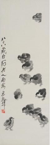 此幅《雏鸡》为白石老人晚年八十八岁时所作。11只小鸡雏概是应了母鸡的呼唤或是食物的诱惑,正三五成群的自画面右侧向左侧飞奔而来,有的还不忘低头寻觅一下脚下的食物。小鸡雏之间有疏有密,构图巧妙,画面具有一种生命的张力。右侧的题款“八十八岁白石老人尚客京华”一气呵成,为整幅作品画上了一个圆满的句号。