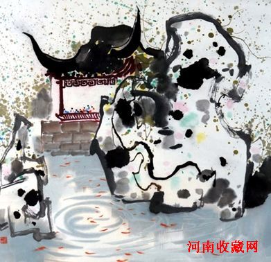 苏州园林一直是江南之子吴冠中难以割舍的情怀。此幅《苏州园林》内容丰富,亭榭回廊、山石树木、黑瓦白墙、溪泉湖瀑、游鱼飞鸟、人形花影…无不被吴冠中先生尽揽画中。最巧妙之处在于构成作品的所有元素都充满了律动之美。在风中轻舞飞扬的蔓藤,透而瘦的湖石,翼然欲飞的水阁檐角,涌动的游人,涟漪的水面,特别是那一群游鱼,碧水红磷,相映成趣。池中鱼儿好似翩翩舞动的枫叶一般,有的悠哉游哉,有的在一起嬉戏,十分热闹。