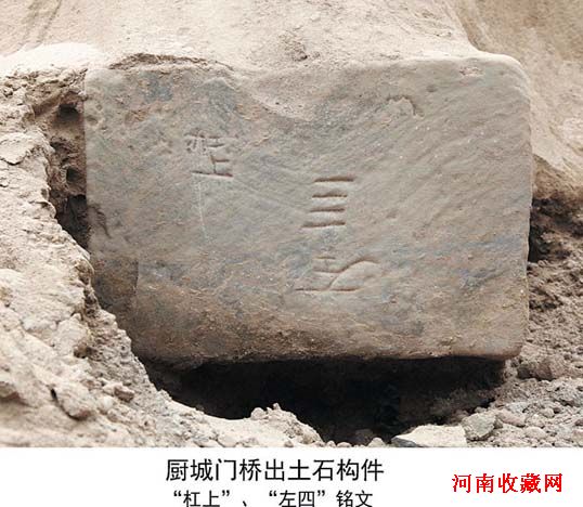 从散落的石构件看,其大体可分规格不等的四种形状:长方形石构件,边长0.9~1米、宽0.43~0.75米、厚约0.33~0.47米;近方形石构件,一种边长0.69~0.7米、厚0.42米,一种边长0.93~0.96米、厚0.38米;长条形石构件,残长1.2米、宽0.4米,厚0.33米;五边形石构件,一种通高0.93米、顶边长0.5米,底边长0.73米,厚0.53米,带边长0.08米、深0.08米卯眼,一种通高0.97米、顶边长0.5米、边长0.6米、宽0.7米、厚0.52米,中部带榫,直径0.12米、高0.04米。在一些石块侧面有“巳”“杠上”“左四”“子五”等题刻。从未经扰动的河道堆积看,在桥桩露头下2~3米左右还有各种规格、形状的石构件散落分布在桥桩之间。