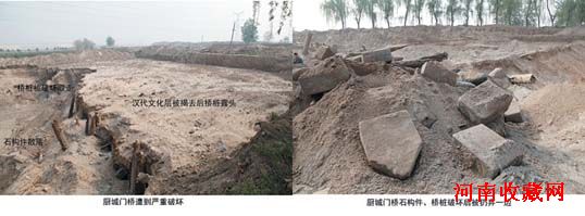 洛城门桥,位于一个东西约44米、南北约100米,面积约4100平方米的北侧有坡道的曲尺形挖沙坑内。该坑在去掉1~1.2米左右厚土层后,即在沙层表面暴露出桥桩顶部。调查时该坑已暂停挖沙,坑内竖立3根桥桩,沙坑周围扔弃有10根桥桩。在此坑北侧96米左右另一挖沙坑南壁下,可见到竖立桥桩1根,北侧200米左右一挖沙后用垃圾回填坑的附近,也扔弃有5根桥桩。
