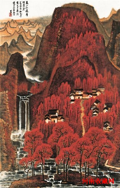 李可染创作于1964年的《万山红遍》取毛泽东“看万山红遍,层林尽染”诗句而成。1962至1964年之间,李可染偶得半斤故宫(微博)内府朱砂,便大胆尝试用朱砂写积墨山水,创作了“万山红遍”题材。据介绍,李可染“万山红遍”共有七幅存世,其中三平尺左右的两件分别在1999年和2000年拍出400万元和500万元,以创纪录的价位带动了艺术品市场的发展,尺幅最大的三件作品中,两件分别藏于中国美术馆和荣宝斋(微博),此次保利春拍上拍的这件十平尺的《万山红遍》是民间流通作品中尺幅最大的一件。
