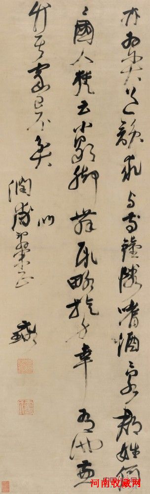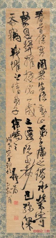 倪元璐《草书五言诗》是他风格成熟后相当难得的一幅佳作。从450万元起拍,经过20多轮的竞价最后以862.5万元成交。本幅系为香港佳士得2004春拍《古代书画》封面作品,出版于日本二玄社《倪元璐の书法》。由卞文瑜上款,戴培之旧藏。