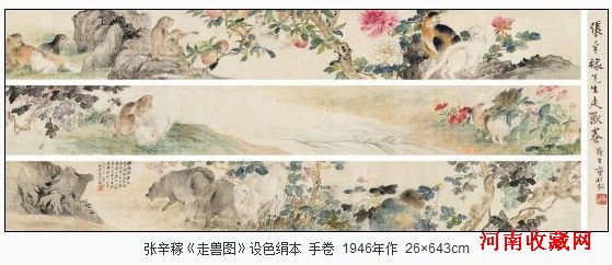 此幅《走兽图卷》手卷在下场的画面上描绘了数种动物,隐匿在山石草木之间,一派田园风光。张辛稼的花鸟画非常注重写生,他徜徉于青山绿水之间,对众生万物做细微的观察,将明暗变化引入花鸟画创作之意。画中花鸟走兽,形体结构描绘准确,但却不背离中国画笔墨的基本特征,他坚守“自我而创,自我而变”的创作理念,使用彩色来表现了花卉、动物的明暗变化,并用笔墨来打破传统束缚,用色用笔大胆,风格别具。画中所绘动植物皆以偏锋粗笔撷取树石、花草、走兽的大势,哪怕是小到一颗草他都详尽描绘,画面生动活泼,体现了大自然春光明媚的气氛,极富生活趣味。他的赋色鲜艳亮丽,淡雅别致。纵观整幅画面,构图饱满,猪彘悠闲地在散步,山羊回眸望着篱栅隔壁的刺猬,苍劲的藤蔓上挂满了葡萄,几只松树在追逐嬉戏,河岸边兔子在安静吃草,河水潺潺,以细笔勾勒,河对岸狐狸母子躺着休息,一块巨石高高耸起,猴子在欢快地摘桃,牡丹花下两只猫在窃窃私语,好一派世外桃源的景象!整个场景布置疏密有秩,看似冲突的动物在这个画面上却是如此和谐,静中有静。赏此画,顿觉凉爽秋风透沁心脾,美哉!