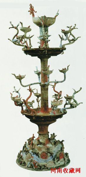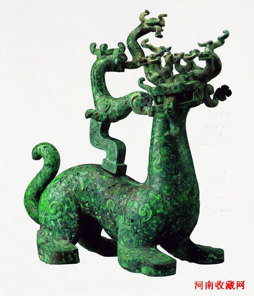 神兽多枝灯造型的创意应当来源于桃都树的传说,据说东南桃都山上有大桃树,树颠有天鸡,天鸡一叫而凡鸡皆鸣,天为之晓。除此之外,汉代还有以扶桑树造型所制多枝灯。