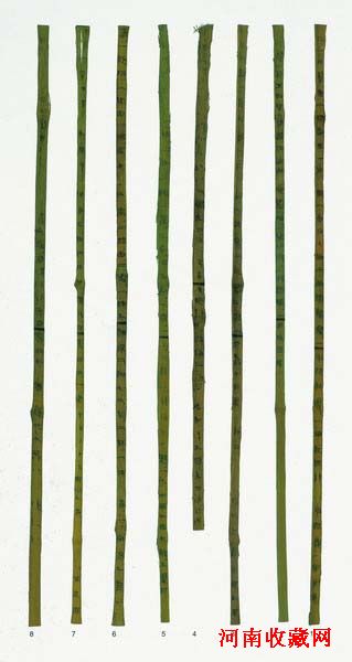 楚国历来被中原各国以蛮夷视之,虽极力追摹中原礼制,但楚人骨子里带有一种神秘奇谲、浪漫潇洒的特质。此种特质决定了楚人尤重感官、视觉之冲击。春秋以后,楚国蔚然成为一大国,所谓“地广千里、披甲百万”,国力的提升促成自我意识的觉醒,文化礼制上,楚人不再以踵迹周人为尚。在书法艺术中,渐渐抛弃宗周大篆书法模式,确立更为图案化的字形,使楚国文字极具装饰性,此点于战国时期的鸟篆书中体现至为明显。此8枚竹简为信阳长台关1号墓出土的遣册,所谓遣册即随葬品清单。根据对遣册文字考释,可借以窥知战国时期楚国名物制度及丧葬礼仪。