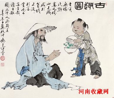 范曾先生作于1991年的《古趣图》也堪称精彩,此作发表翔实。作品中绘一老一少,优游自在,少者正从两碗间放出一只青蛙,活灵活现,趣味盎然。其趣味,不是简单的现代生活所可以显现的,所以称“古趣”,其味道甚悠远。是作题款有云“古有无怀氏,黔娄之俦也,不戚戚于贫贱,不汲汲于富贵,而今安在哉?读《古趣图》,画中人庶几矣”,内中可见作者心胸,其所思在远道, 乃通过笔墨发思古之幽情。读范先生此作,或许可以启发我们一些来自画面又延展到画外的考虑。作为艺术品,在视觉审美的同时,若能引发一些形而上的思辩,到哲学的味道,才能称之为艺术品的最上乘之作。