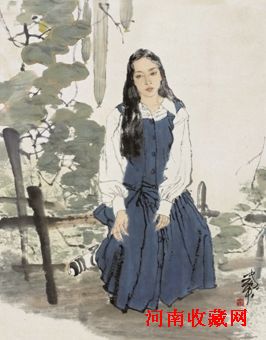 经何家英本人鉴定过的《悠思》属何氏的写意精品。此幅描绘了一蓝裙女子坐在瓜蔓下静静冥思的情景,画中少女娟质娴淑,嘴角轻含,眼如带波,有一种刚强坚韧的力量,眼神里却透露出一份伤感和迷离。何家英笔下的女子清新自然、雅致而清丽,既具备了传统文化中的古典美,又不失现当代女性的文化内涵。这一对看似矛盾的概念,在他的笔下合理、完美地融合了,传达出他对女性多角度、多层次的审美观,堪称何氏写意佳构。