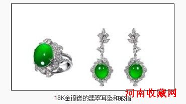 拍卖会将推出一套18K金镶嵌的翡翠耳坠和戒指,其中耳坠总重为34.41g。镶嵌于耳坠正中的正阳绿翡翠,颜色均匀亮丽,质地纯净无瑕,非常稀少珍贵,具有收藏价值。四周镶嵌着一圈小圆钻,使得光在钻石间有规律的跳动。瑰丽多变的火彩、夺目的金刚光芒与翡翠的深邃柔和相对比,让此款翡翠耳坠中西结合,别具一格。翡翠18K金镶嵌的戒指,总重为76.29g。此款产品的翡翠拥有上好冰种翠质,种质纯净清透,色泽艳阳均匀。估价:800万-1280万。