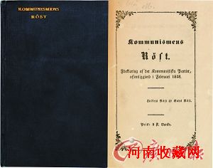 1848年瑞典文原版《共产党宣言》首次在国内亮相。在即将举行的上海鸿盛2012春拍“纸杂文献”专场中,源自欧洲重要私人收藏家之手的重量级善本具有极高的历史价值。