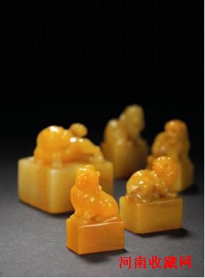 本次西泠2012春拍有幸征集到艺术品收藏巨擘阿部房次郎旧藏的田黄石古兽钮章五方,最大者重186.7克,最小者也有38克,皆成章形,作古兽钮。石质温润细密,色泽沉稳,萝卜纹及红格等特征显著。所作兽钮造型古朴苍劲,殊为难得。