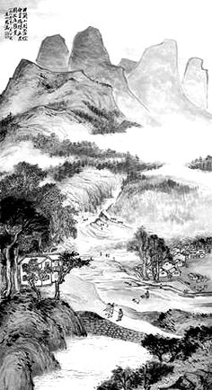 此画远、中、近景层次分明,随着视线的深入,景深也层层推进,既有国画章法的深远意境,也不乏西洋画构图的透视效果。画面近景为一泓清波荡漾的池塘,一条平坦的土路蜿蜒伸向丛山深处。路上有农人荷锄结伴而行,路边楼房林立,坡下良田万顷,农民正在田间插秧备战春耕。在中景,画家用之字形的构图来表现群山中的葱郁林木,显示出井冈山逶迤蜿蜒的龙脉所向。而如屏障般矗立的远山群峰作为此画的远景,把观众的视线引向了更为深远的地方。